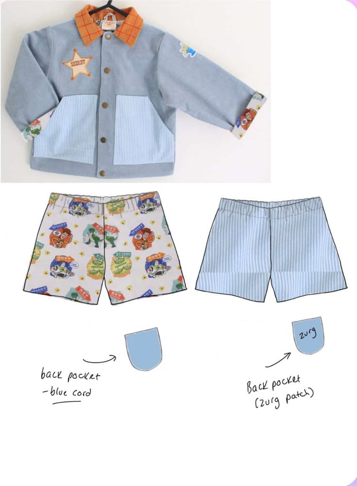 Custom woody jacket with 2 pairs of matching shorts, age 18-24 months. Custom Pooh jacket (3T) with 2 pairs of matching shorts, age (3-4).
