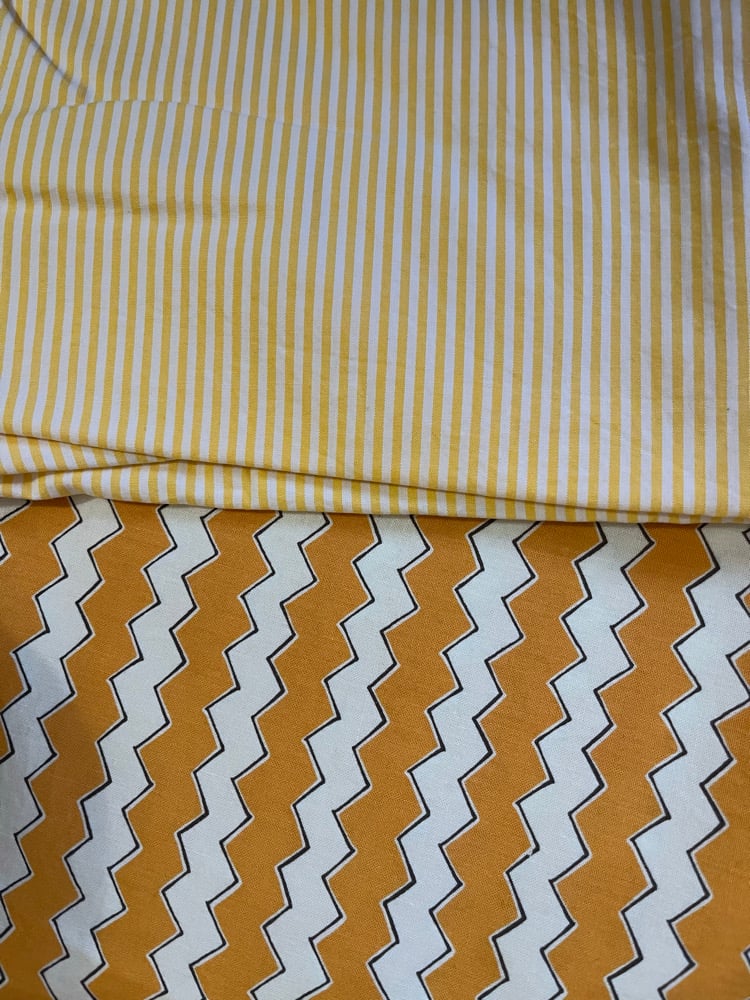 Yellow zig zag one side, yellow stripe on the other. Age 2-3.