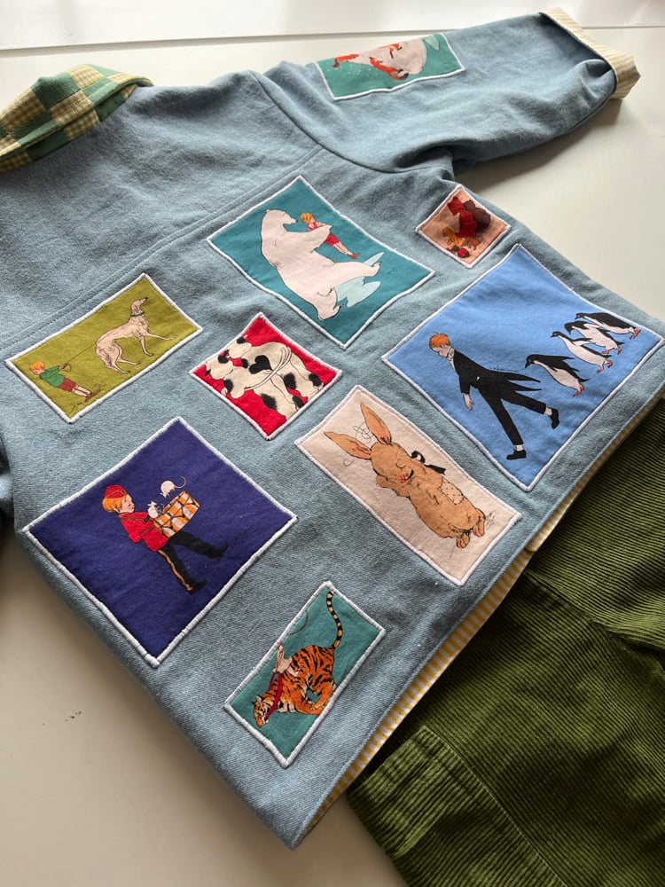 Patch denim jacket, same as original (thicker stitch edges as original) but with yellow/white stripe collar and pockets, the same as the lining. Size 3T. Trousers (non reversible) in age 3-4, in the yellow/white stripe to match. No postage charged, combine with previous order. @elisia_bradshaw
