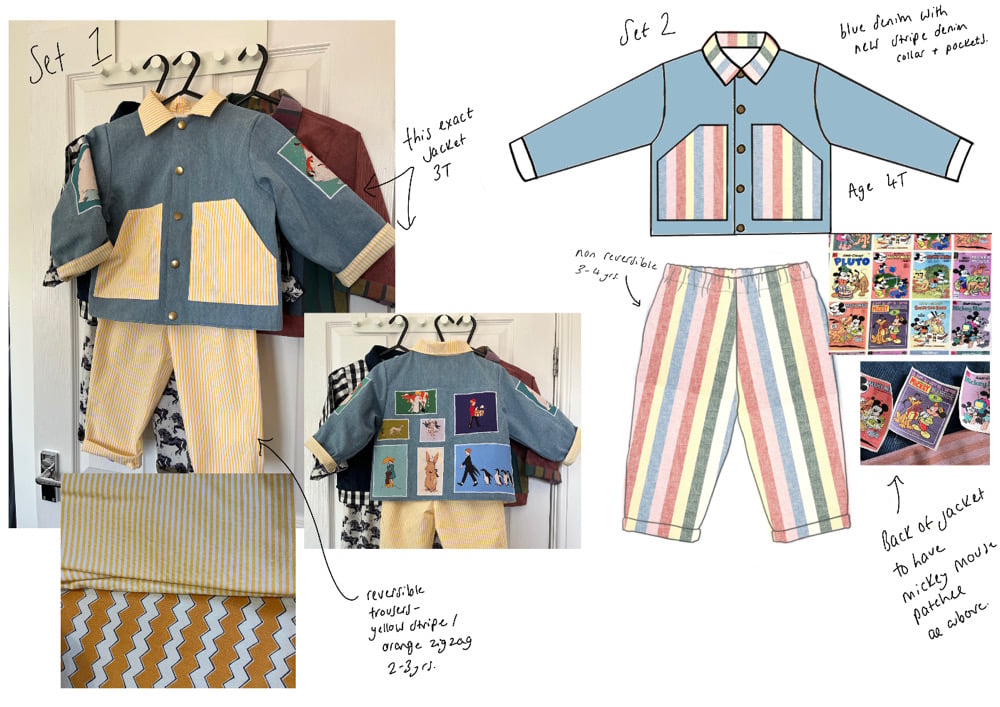 2 x custom sets as shown. Set 1 (yellow stripe patch set) in age 3T, 2-3 reversible trousers. Set 2, (denim stripe and Mickey patches) in 4T, 3-4 years trousers- non reversible. For @lifes_unknown. Listing price includes customs and shipping fees to the US.