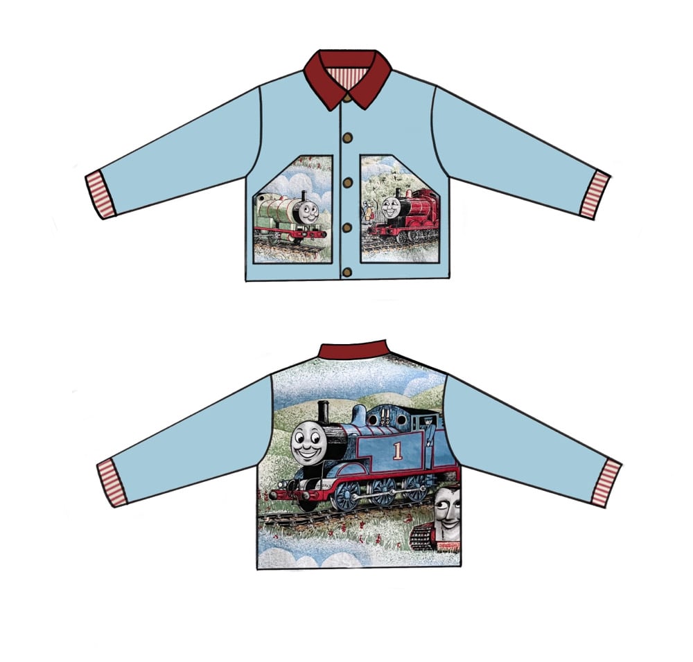 Blue cord, Thomas cotton, red cord collar and red and white stripe lining. Characters to be as they are on mock up. Age 3.